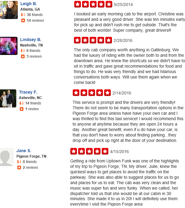 Getting a ride from Uptown Funk was one of the highlights of my trip to Pigeon Forge, TN. My driver, Julie, knew the quickest ways to get places to avoid the traffic on the parkway. She was also able to suggest places for us to go and places for us to eat. The cab was very clean and the music was super fun and very funky. When we called, her dispatcher told us that she would be at our cabin in 30 minutes. She made it to us in 20! I will definitely use them everytime I visit the Pigeon Forge area