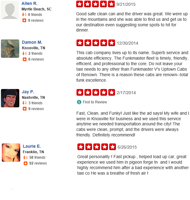 Funkmaster V's Uptown Cabs of Renown 865-384-7589 serves Sevier County, Sevierville, Alcoa, Gatlinburg, Pigeon Forge, Townsend, Wears Valley. 24 hours a day, 7 days a week. We are rated 5 stars on every major website. Fast Clean and Funky. Don't Drive Drunk... Ride With Tha Funk.
